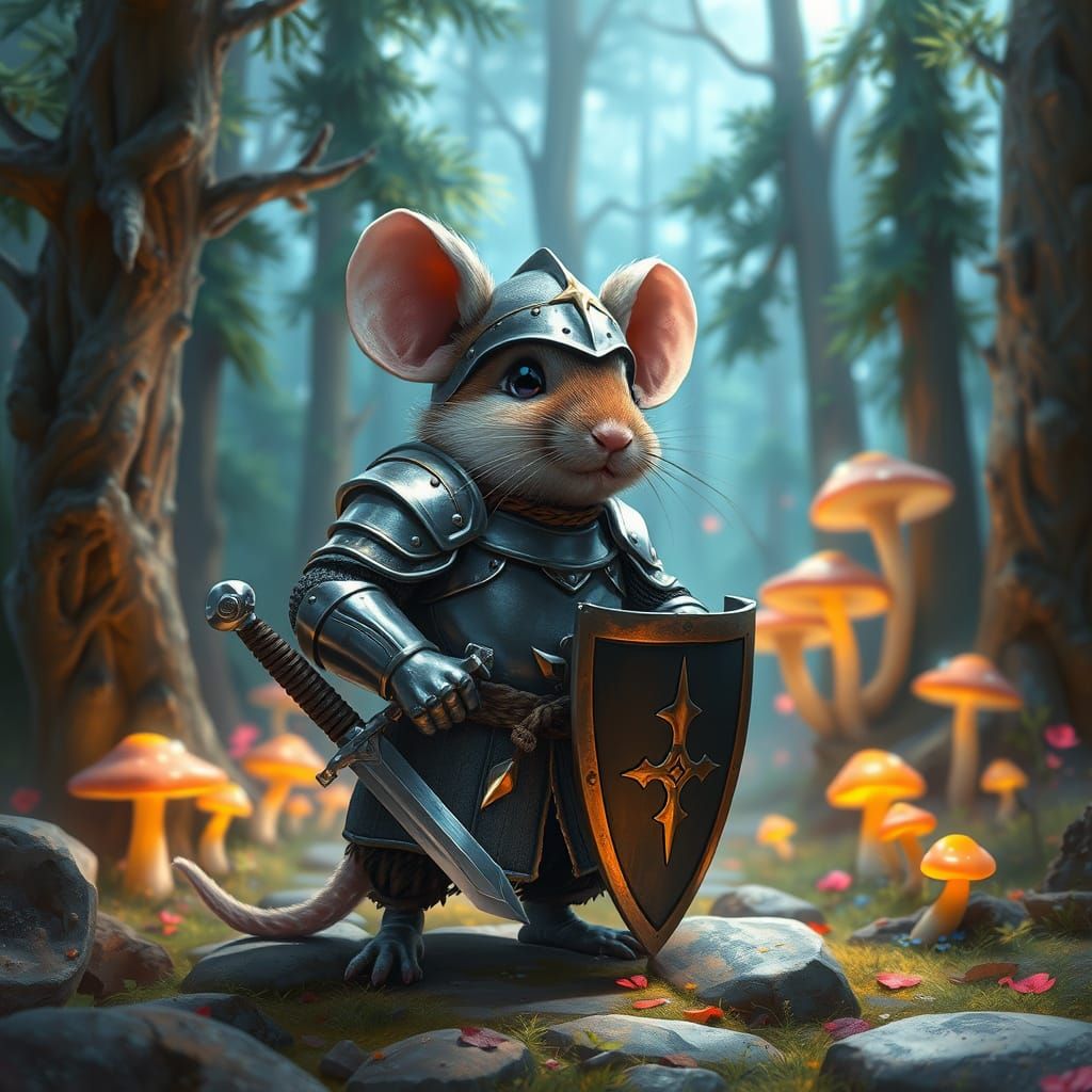 This image depicts a brave mouse knight in shining armor standing guard in a lush, vibrant forest clearing, surrounded by towering trees and glowing mushrooms, rendered in a hyperrealistic style with soft, diffused lighting and painterly quality.