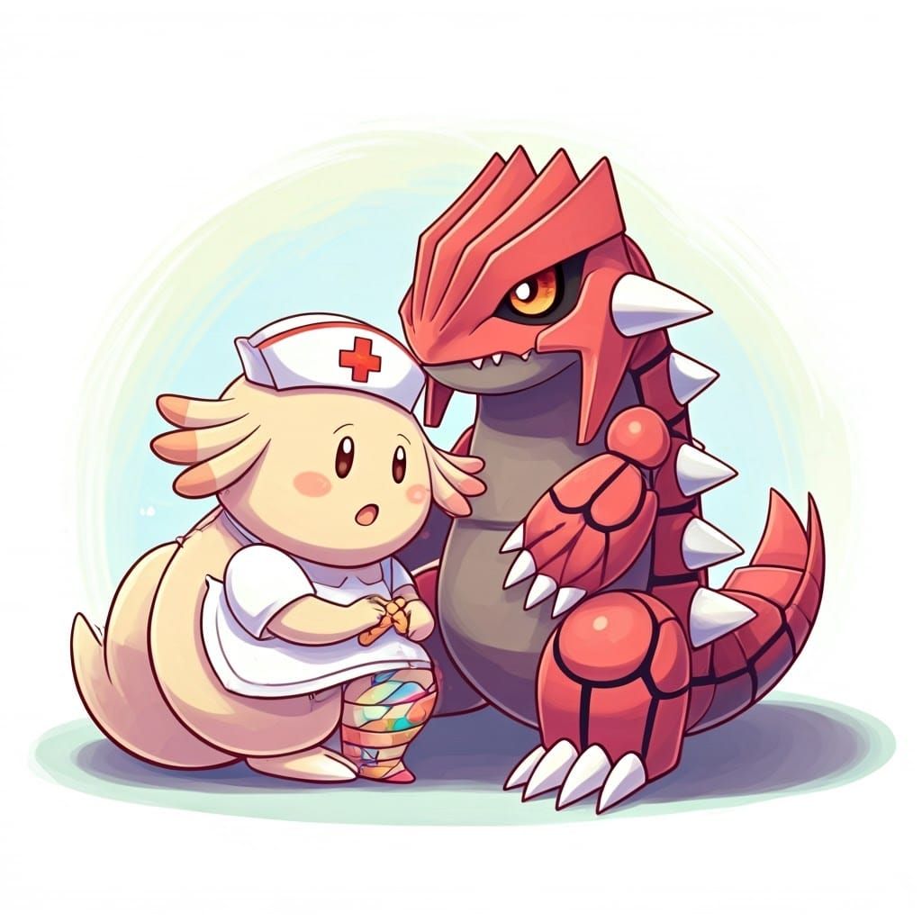 This image shows a heartwarming scene of Chibi Chansey nursing Chibi Groudon's injured leg with a colorful bandage, set against a soft pastel background with vibrant textures reminiscent of traditional Japanese animation.