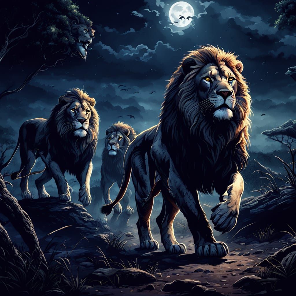 This image depicts majestic lions hunting in the savanna at night. Realistic fantasy art with glowing eyes and extended claws, set against a stormy, moonlit backdrop.