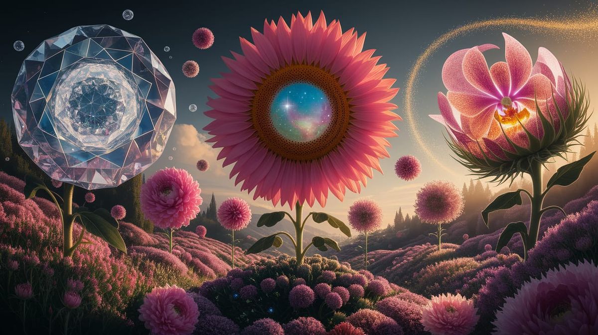 A striking picture of an enchanted flower garden bathed in golden light. Giant flowers bloom, each containing a unique microcosm with crystalline cities, vibrant nebulas, and cascading waterfall ecosystems, all rendered with extreme detail as a surreal botanical illustration.