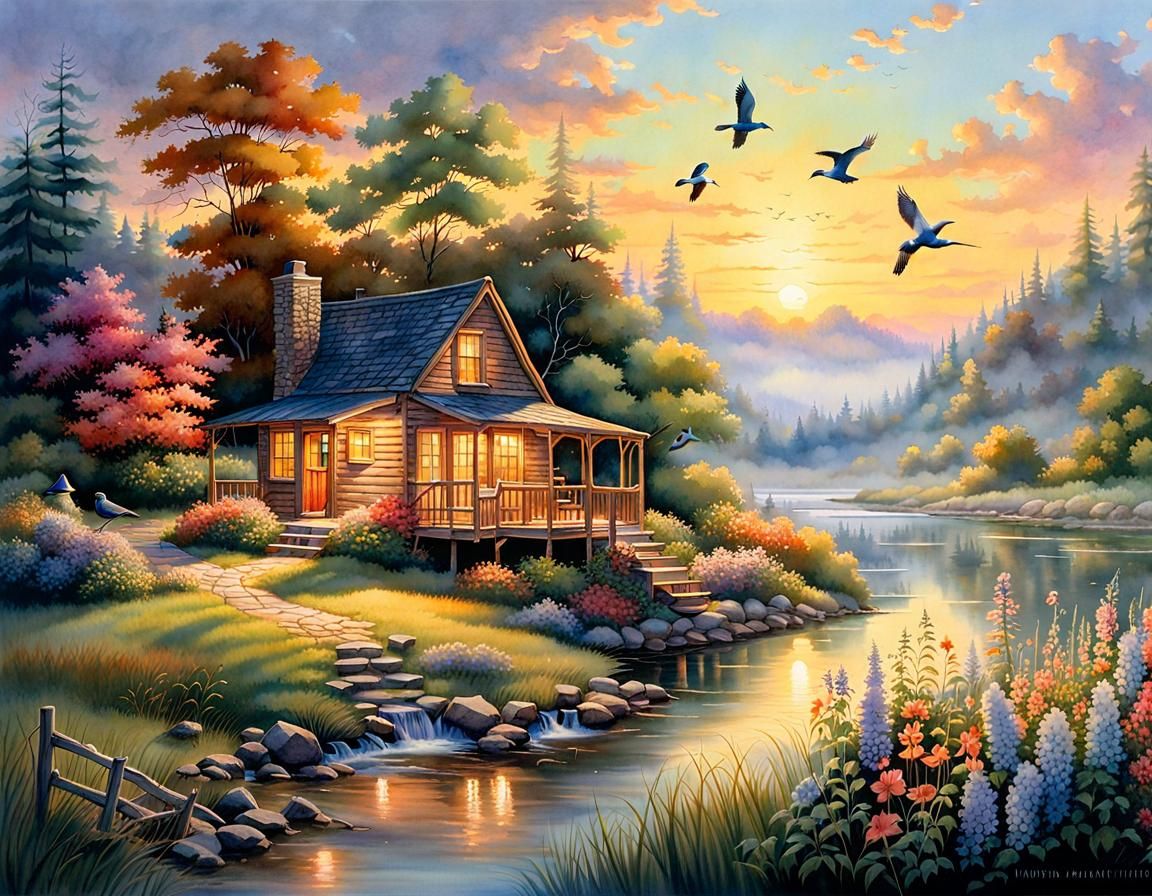A watercolor illustration showing birds, wildflowers, a cabin, and a river at sunset. The artwork uses stylized techniques, soft cinematic lighting, and a pastel color palette to create a fantasy scene.