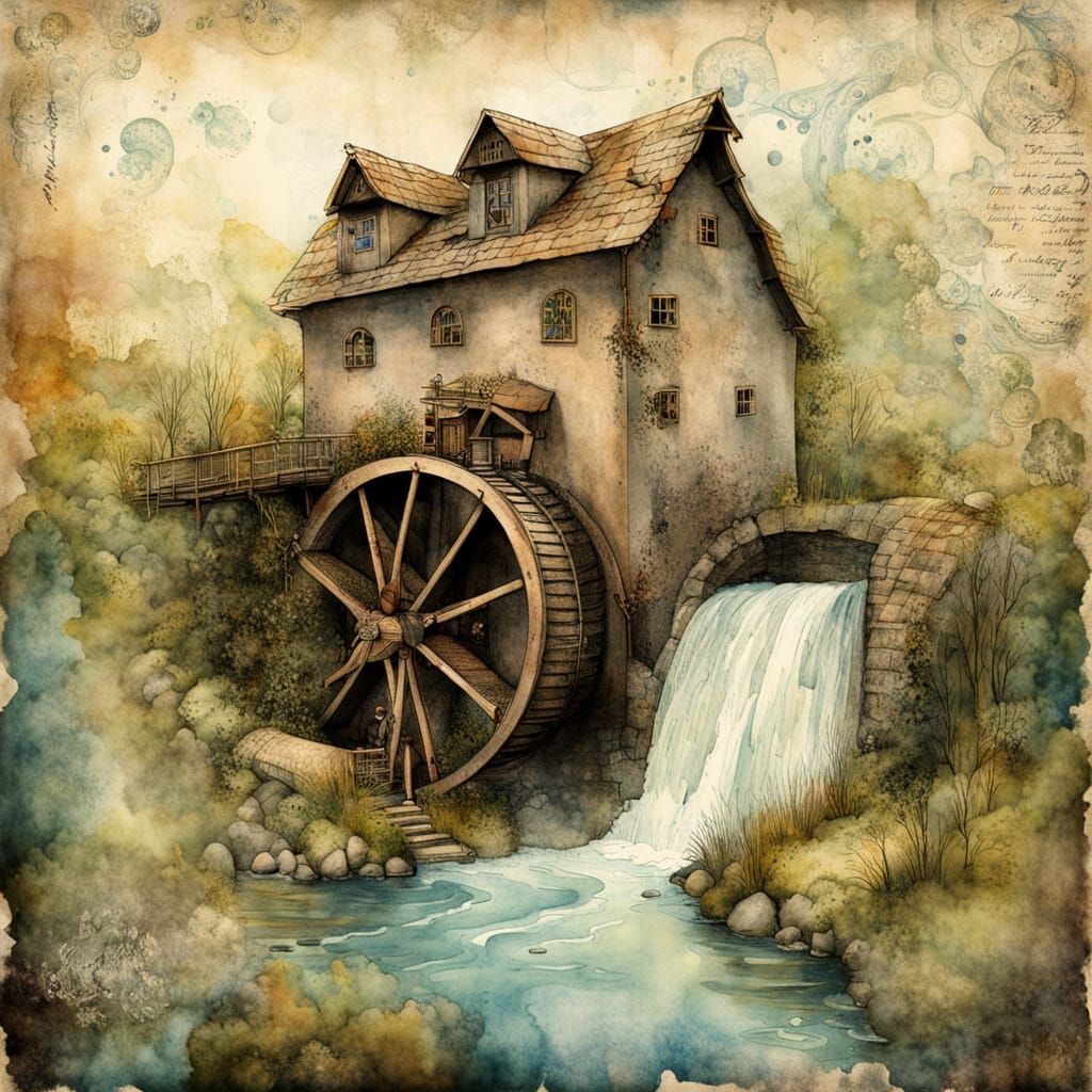 A beautiful watercolor poster of a serene watermill scene, set on old parchment paper with a touch of messy texture, capturing the peaceful atmosphere of a gentle stream running over the wheel.