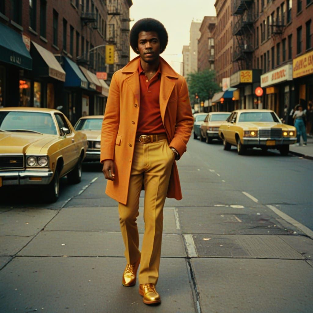 This image shows a medium shot of 'The Guy from Harlem' on a city street. The image has a 1970s blaxploitation film aesthetic, with platform shoes, flared pants, warm golden lighting and vibrant colors.