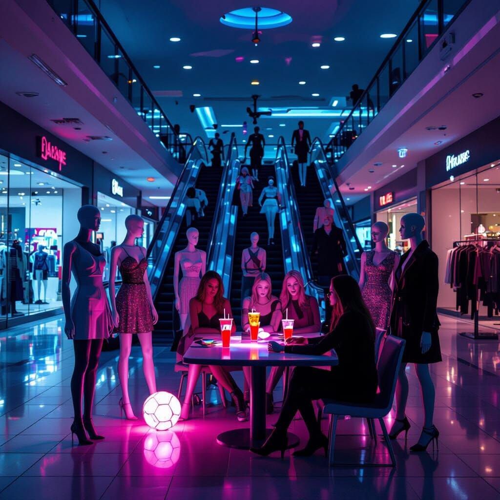 This image shows mannequins that have come to life inside a deserted shopping mall at night. Illuminated by neon lights, they are playing soccer, dancing, and socializing with surreal, cinematic energy.
