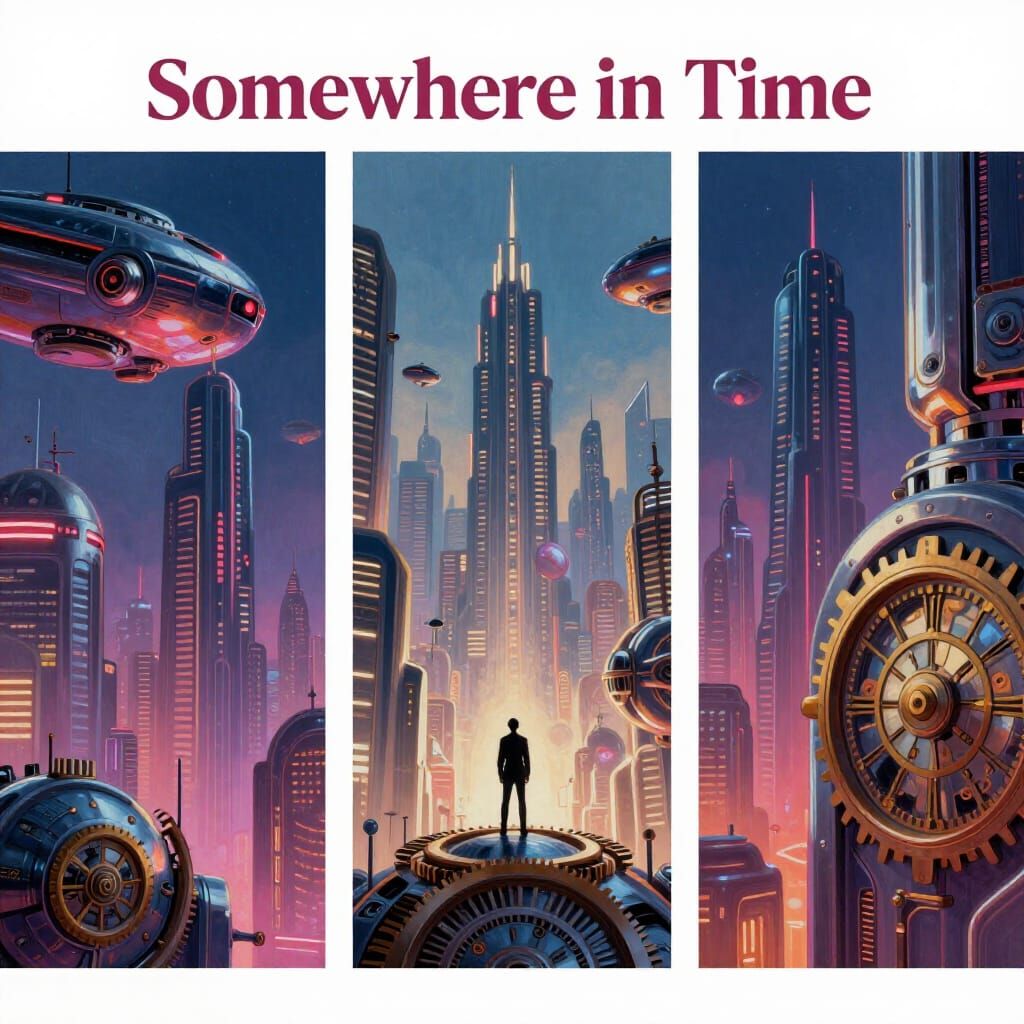 This image showcases a triptych painting of a detailed futuristic cityscape with towering skyscrapers and flying vehicles. It features a lone figure in the central panel, rendered in a vibrant, neon-infused retrofuturist aesthetic.