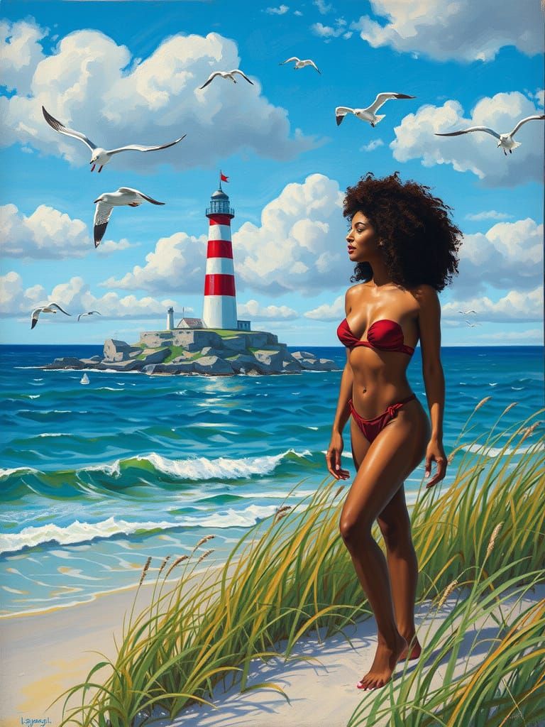 This image depicts a woman in a bikini on a dune, with a striped lighthouse on a rocky island and a vibrant sea. Rendered in a painterly style with visible brushstrokes.