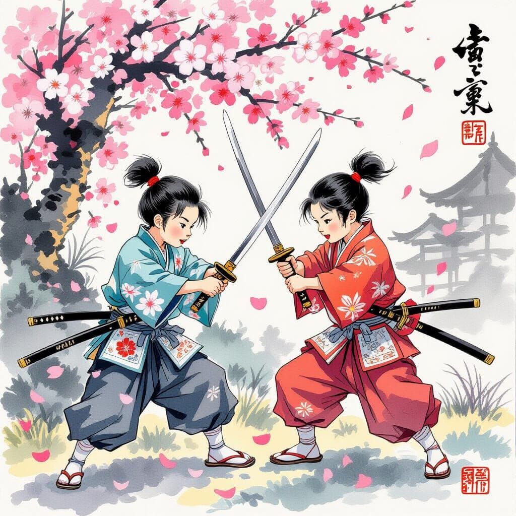 This image shows young boys in Japanese clothing playing with samurai swords amidst cherry blossoms, rendered in a Ukiyo-e style. The artwork features bold brushstrokes and a mastery of light.
