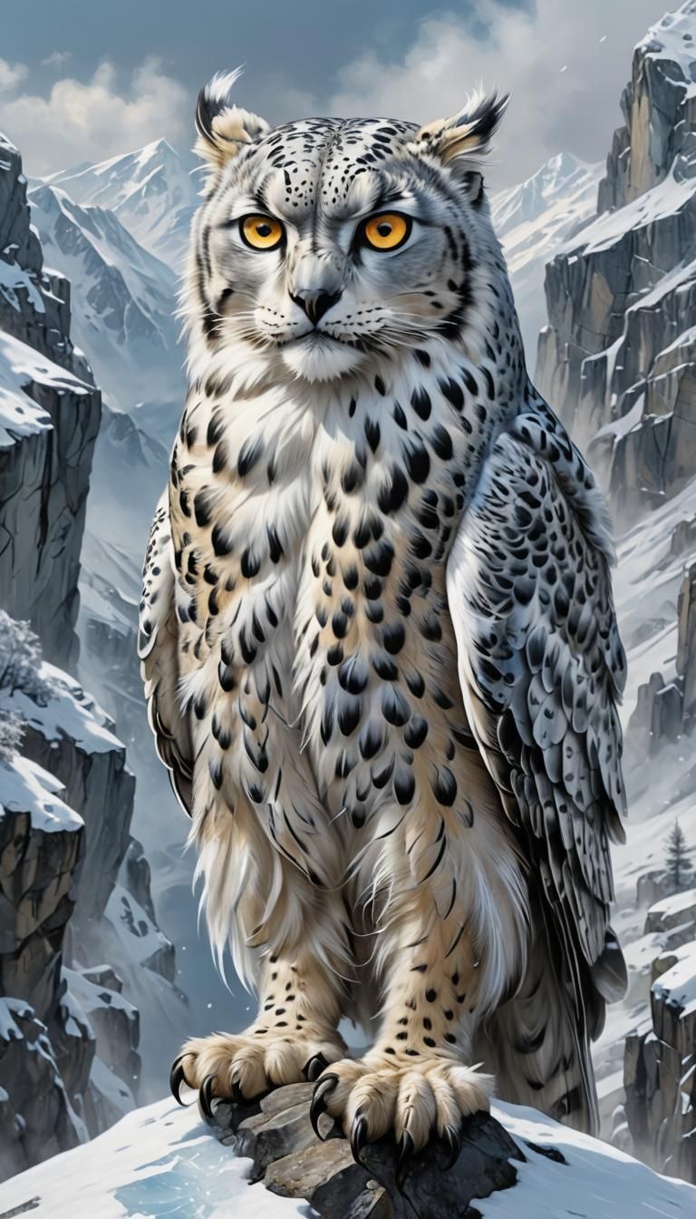 A striking picture of a snow leopard and snowy owl hybrid standing on a snowy mountain ledge. The digital painting features soft textures, icy blue tones, and a fantasy realism aesthetic.