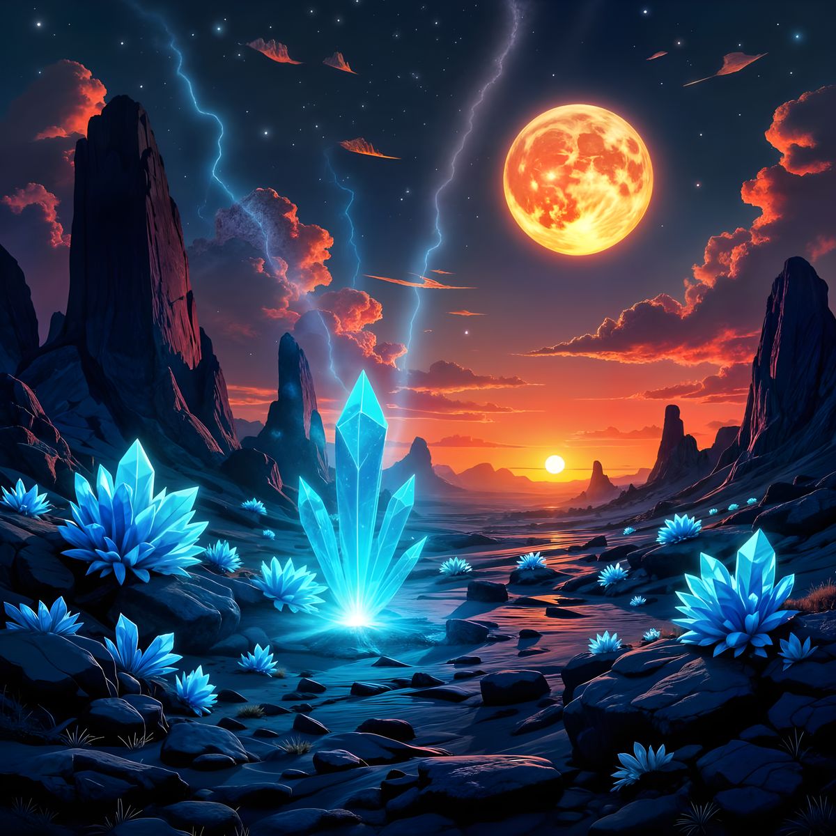 This image shows a surreal alien world with glowing crystalline plants and ancient ruins, inspired by 1950s travel art and photorealism.