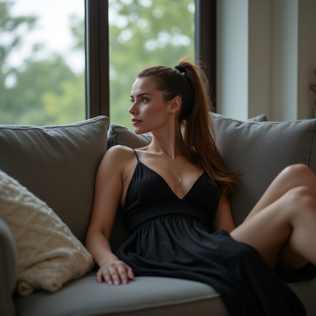 This hyper realistic image captures a 30-year-old woman with brown hair in a ponytail, wearing a black dress, relaxing on a couch in a modern living room on an overcast day.
