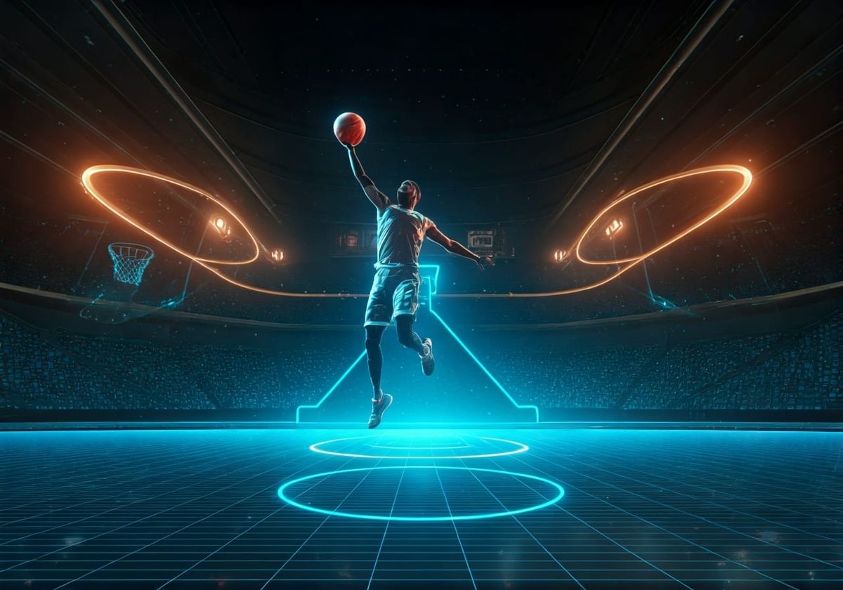 A basketball player in a high-tech uniform dunks in a futuristic arena. The scene features neon holographic lines, a matrix-like grid, and floating scoreboards in a dreamlike haze, with a retro-futuristic aesthetic.