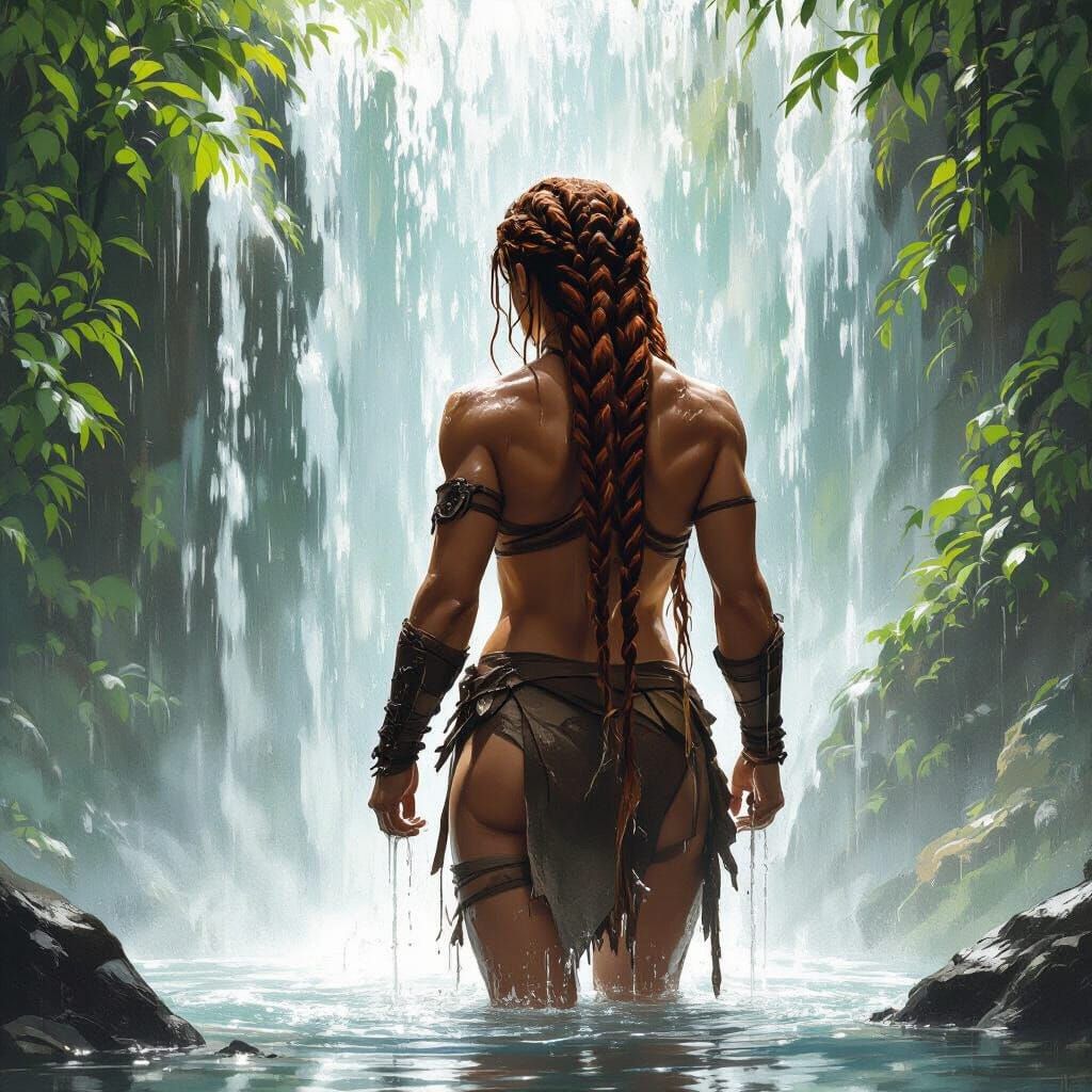 This image depicts a strong, muscular barbarian woman showering under a waterfall, rendered in a dramatic, idealized style reminiscent of Michelangelo's work. It features chiaroscuro lighting and lush natural surroundings.