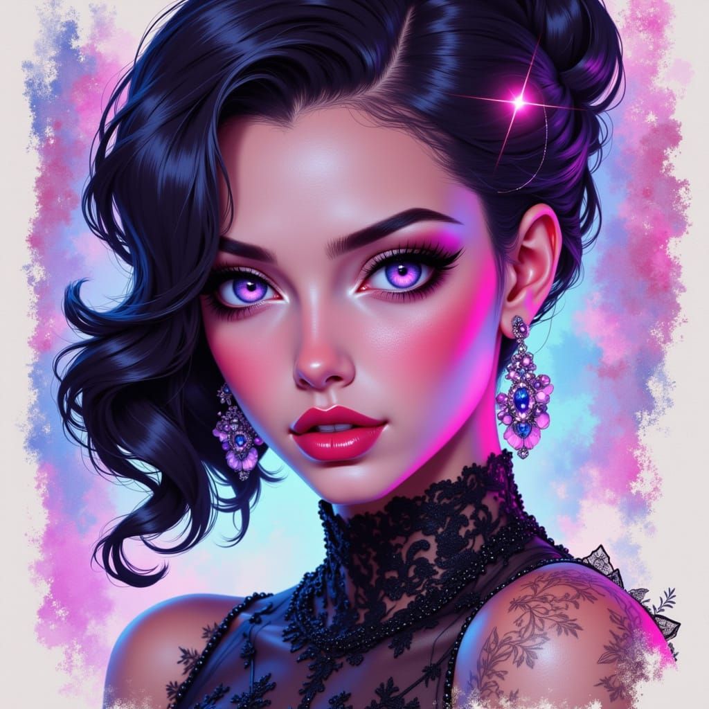 This image showcases a stylish anime girl posing in a sophisticated manner, surrounded by blended watercolor textures, neon hues, and delicate brushstrokes, evoking a high-fashion photography aesthetic with bold colors and dreamy lighting.