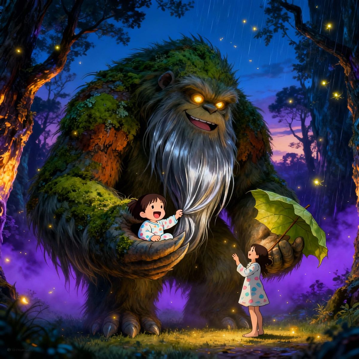 This image shows a massive, friendly yeti-like creature with moss-green fur cradling a joyful child in its hand. The gentle giant shields the child from rain with a large leaf in a twilight forest setting.
