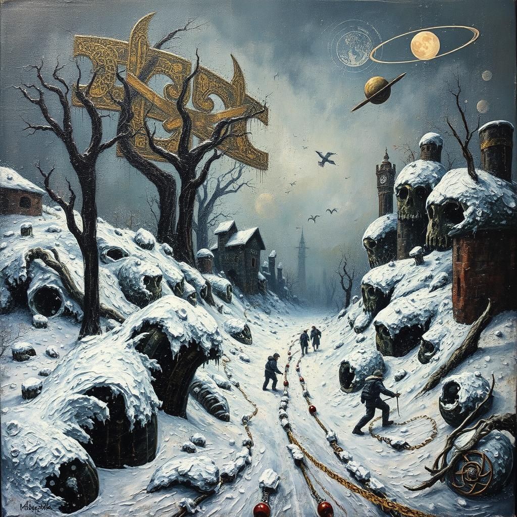 A surreal and chaotic snowscape with Celtic and Art Deco elements. The image is rendered with heavy impasto texture and trompe l'oeil effects, in the style of a heavy metal record cover.