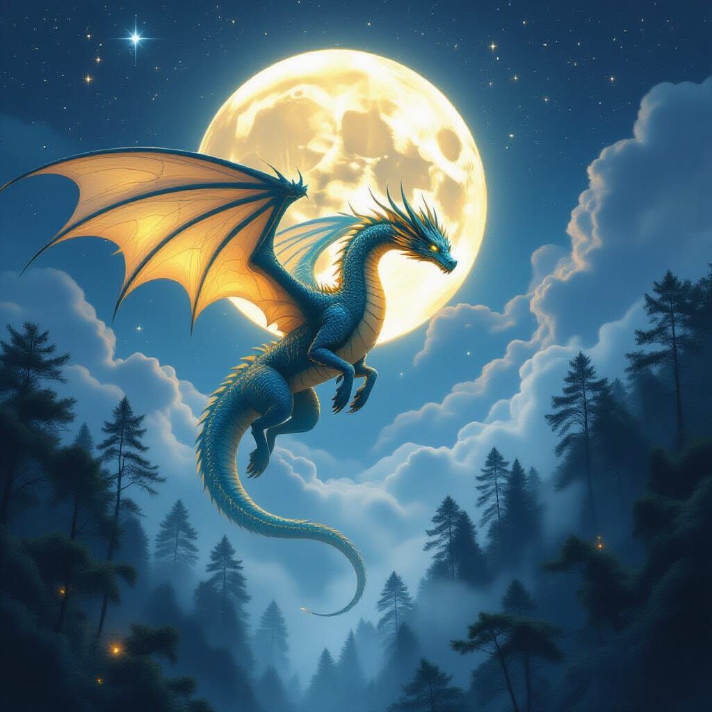 A stunning image of a celestial dragon flying over an illuminated forest. Ethereal mists rise around the dragon, with shimmering scales under the moonlight, in a high fantasy digital painting style.