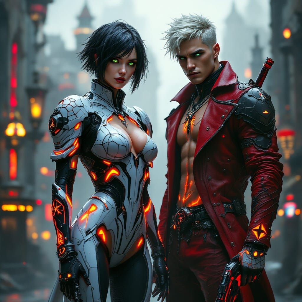 This image features a striking female demon hunter in a high-tech exosuit, standing heroically in a dark, mystical cityscape. She wears a sleek white and black suit with intricate hexagonal panels and bold red and green eyes, while her companion Dante stands ready in his dramatic red leather outfit, with...