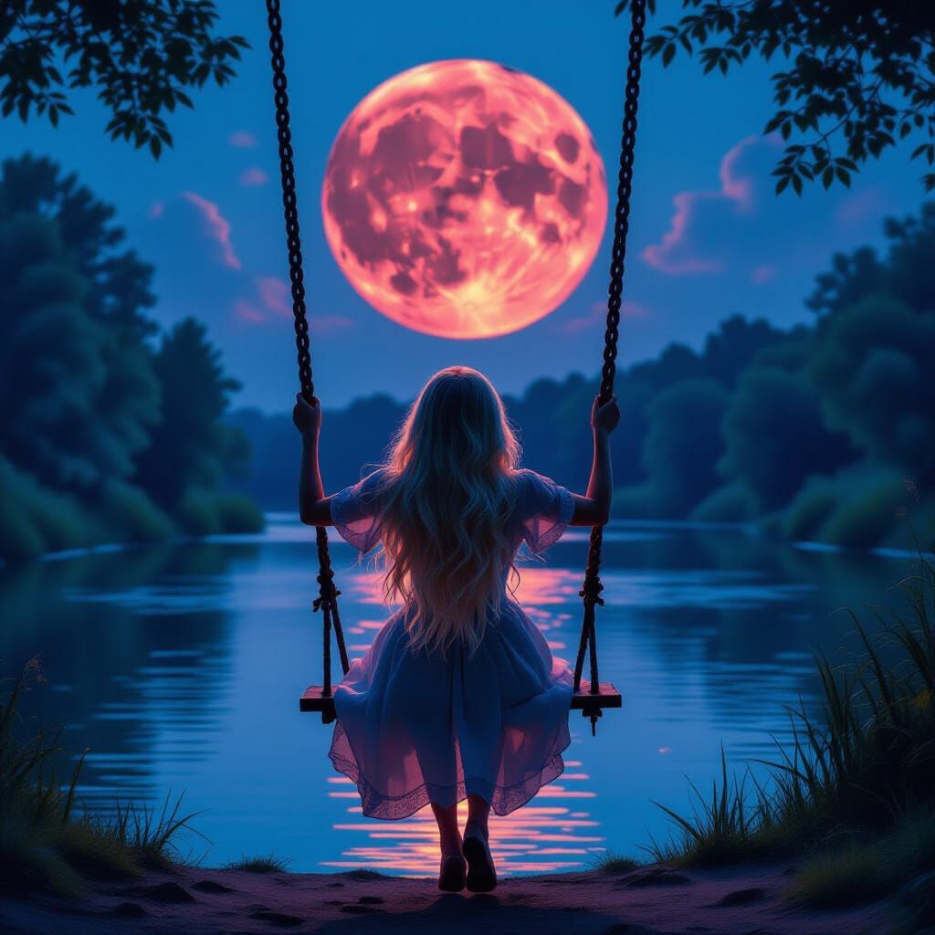 This image captures a woman with blonde hair and pink streaks swinging by a river under a blood moon, reflected in the water. It features cinematic lighting and vibrant colors in a romantic, atmospheric style.