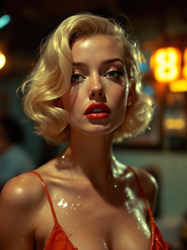 This image shows a 1950s-style blonde pin-up woman making direct eye contact. The photograph is reminiscent of documentary photography, with harsh lighting and oversaturated colors to highlight the subject.