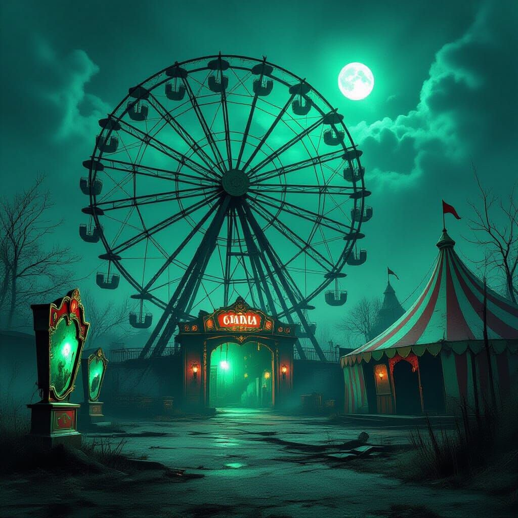 This image depicts a derelict carnival repurposed as a villain's lair. A gothic horror concept artwork showcasing a rusted Ferris wheel surveillance tower and eerie green lighting within decaying circus tents.