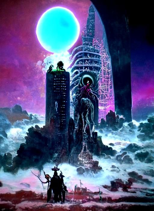 The Adventures of Anshar and the Demiurge building the 1st cosmic city in our universe synthwave neon retro Anime horror Gustave Doré Greg Rutkowski