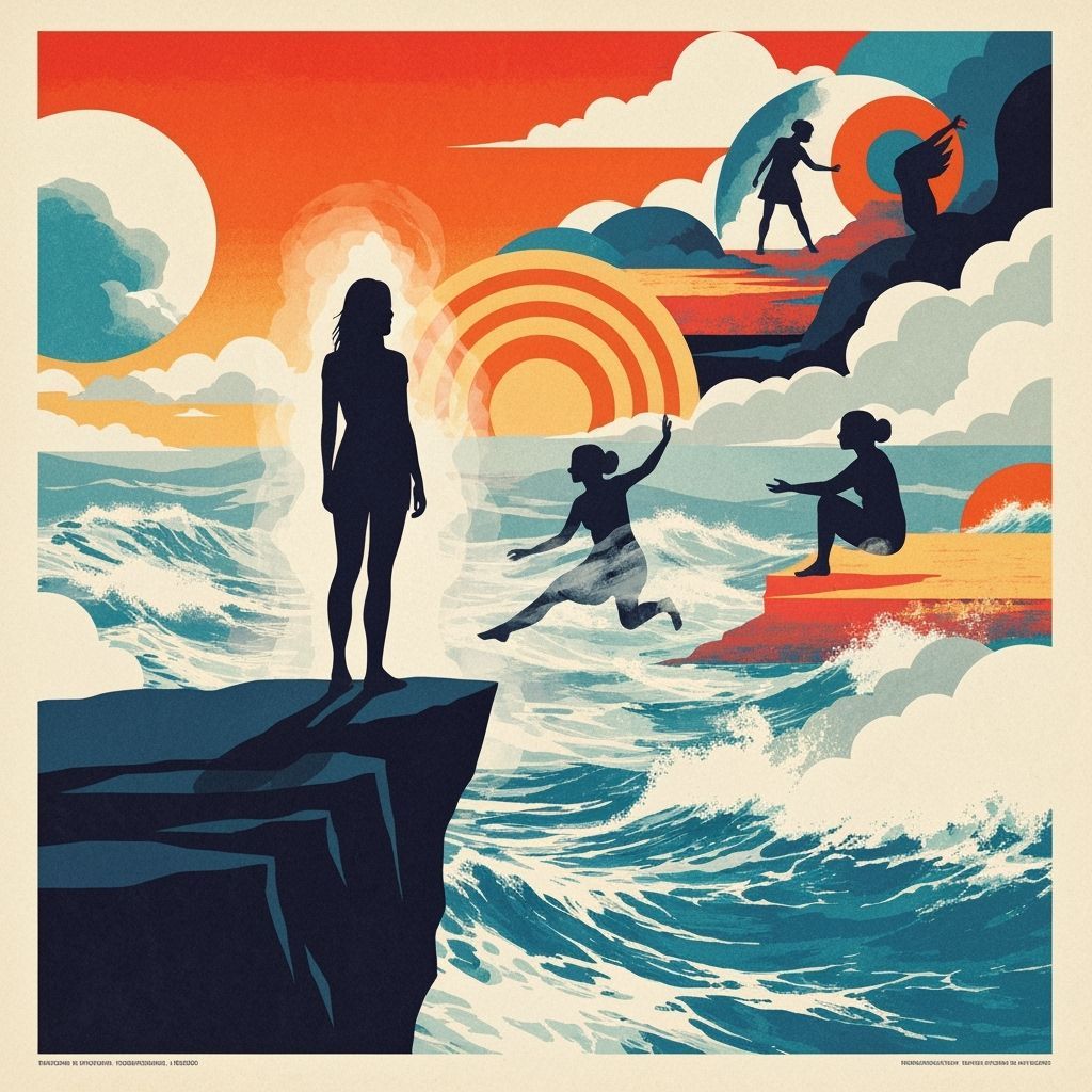 This image depicts a lone woman on a cliff edge, facing a chaotic, abstract sea. The style evokes vintage travel posters with bold graphics and a dreamlike, surreal collage aesthetic reminiscent of 1970s printing.