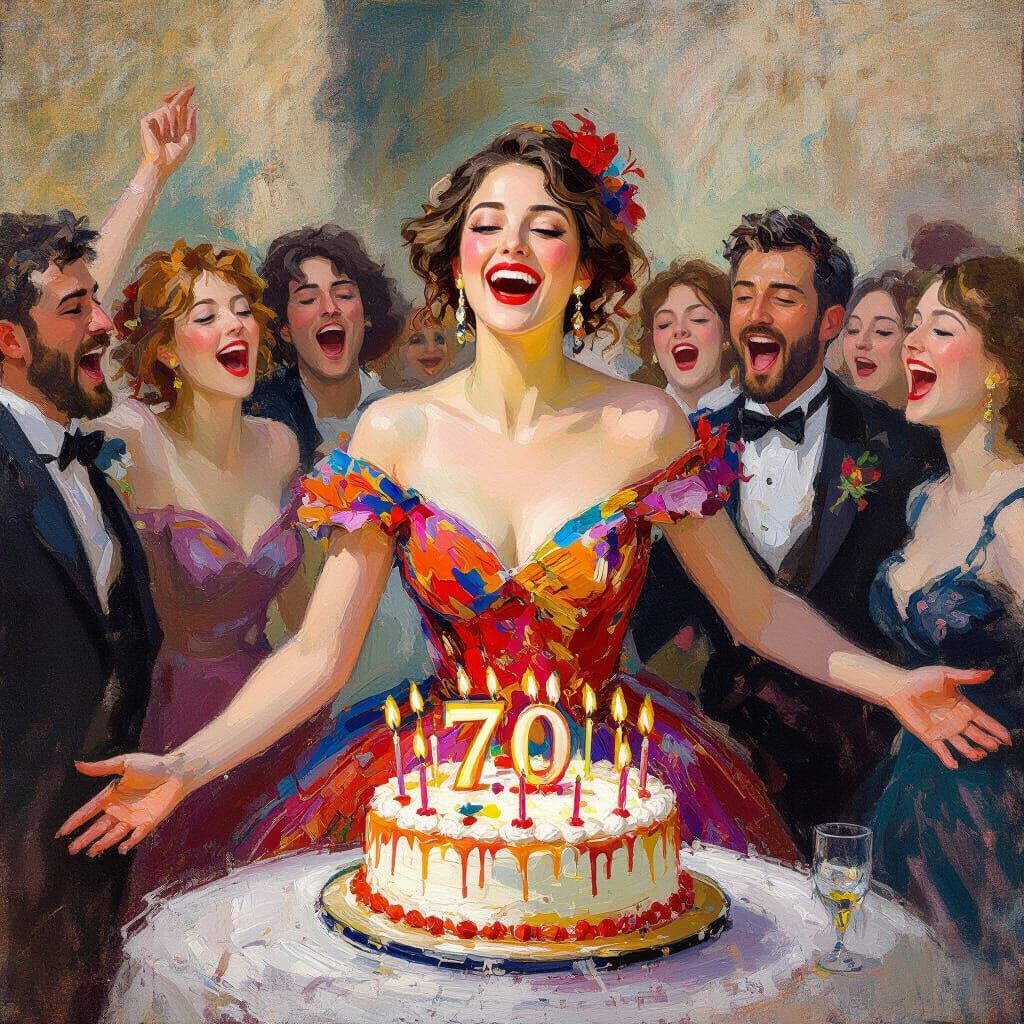 This image shows a woman celebrating her 70th birthday in an impressionistic style. The scene depicts a joyful gathering with people singing in front of a cake adorned with numerous candles.