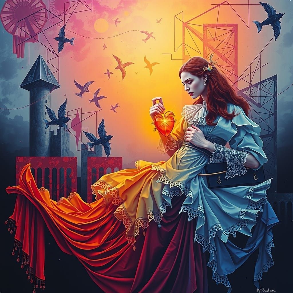 This image shows a majestic, winged figure in gothic attire, set against a stark black and white background, surrounded by abstract geometric shapes and bold textures, evoking the spirit of Dada and gothic romanticism, with a sacred heart emanating a warm, golden glow.