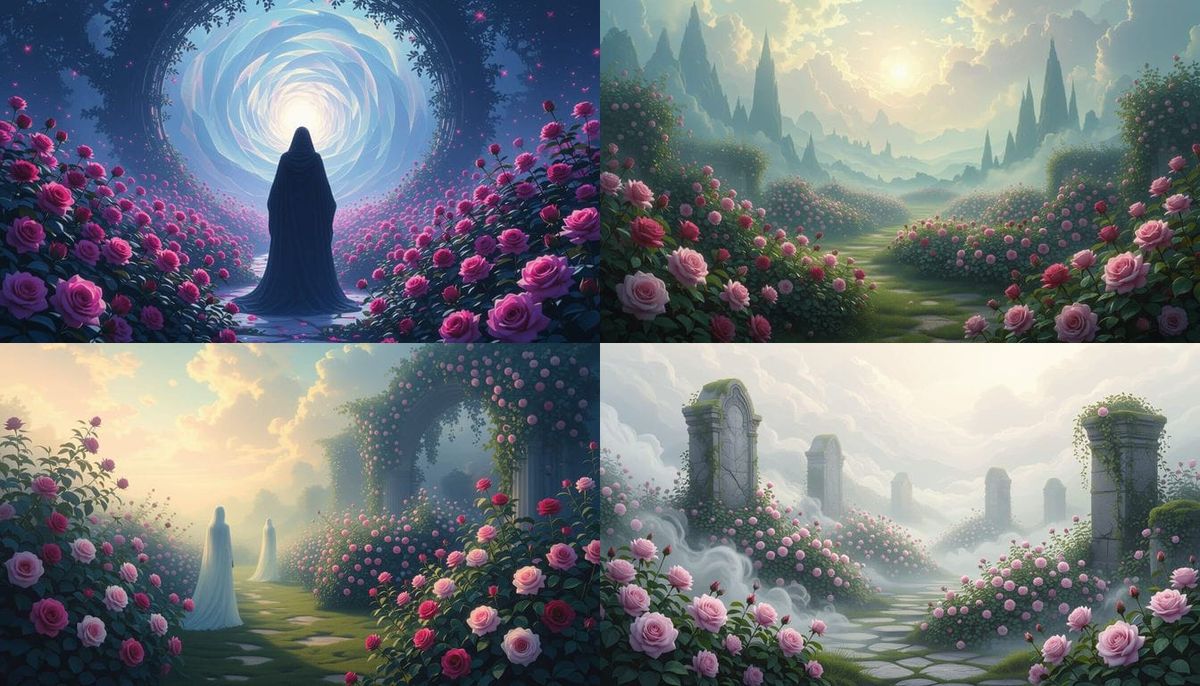 This image depicts a mystical landscape featuring spectral rose gardens within a timeless spiritual realm, evoking a sense of fantasy and otherworldly beauty.