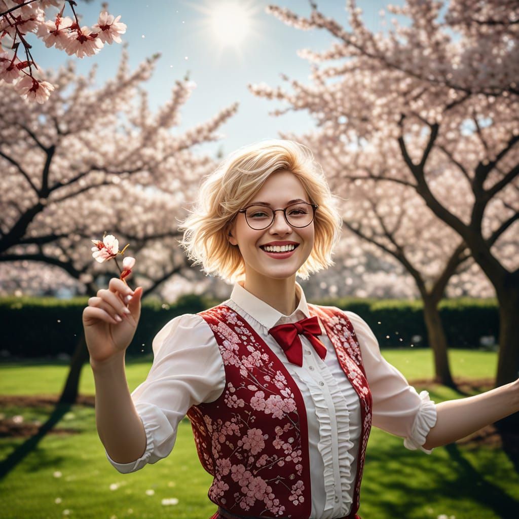 This hyperrealistic image captures a woman with blonde bob hair, a ruffled blouse, and red vest, smiling with open arms. Cherry blossoms fill the air in this cinematic composition with moody lighting.