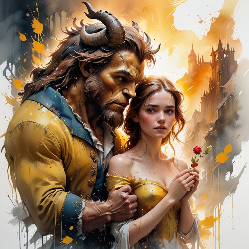 A cinematic oil painting of Beauty and the Beast. The golden-hour palette and hyper-realistic details create a mesmerizing fusion of chaos and beauty, as 8K resolution artwork.
