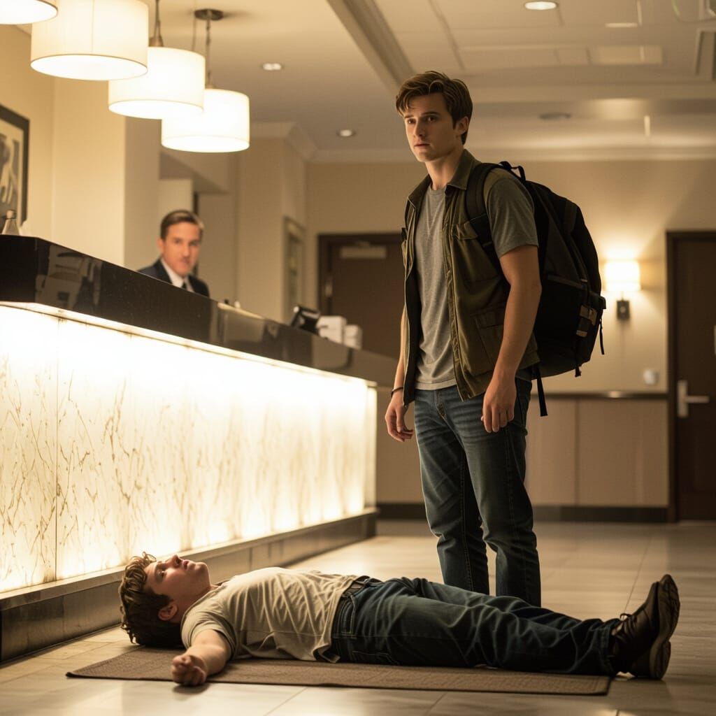 This image depicts a young man's anxious journey through a dimly lit hotel. Inspired by film noir, it features dramatic lighting and a desaturated palette, evoking a suspenseful atmosphere.