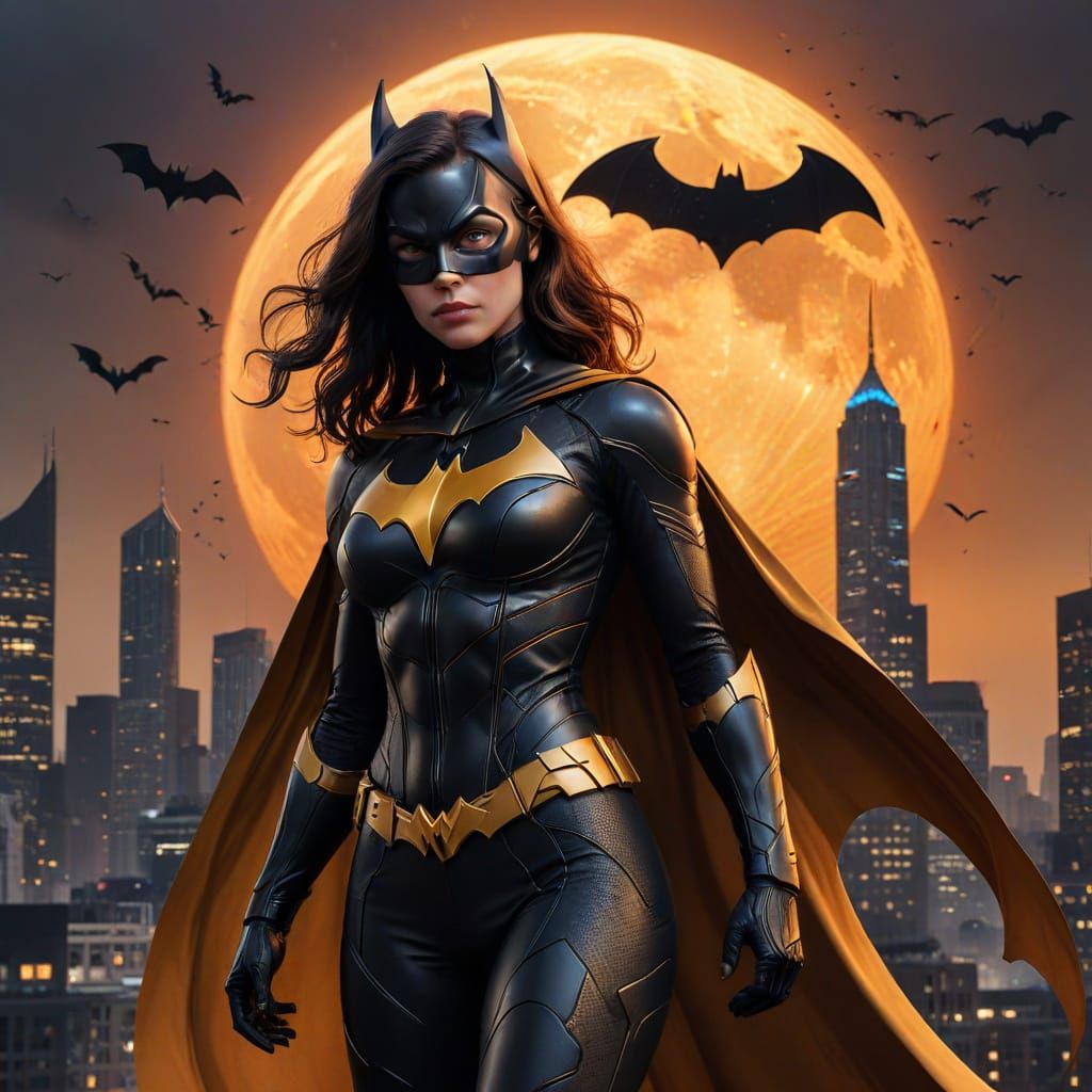 A striking picture of a fierce superhero inspired by Batgirl, posed heroically against a futuristic cityscape. She is clad in a sleek black and gold armored suit with a flowing cape, rendered as digital art.