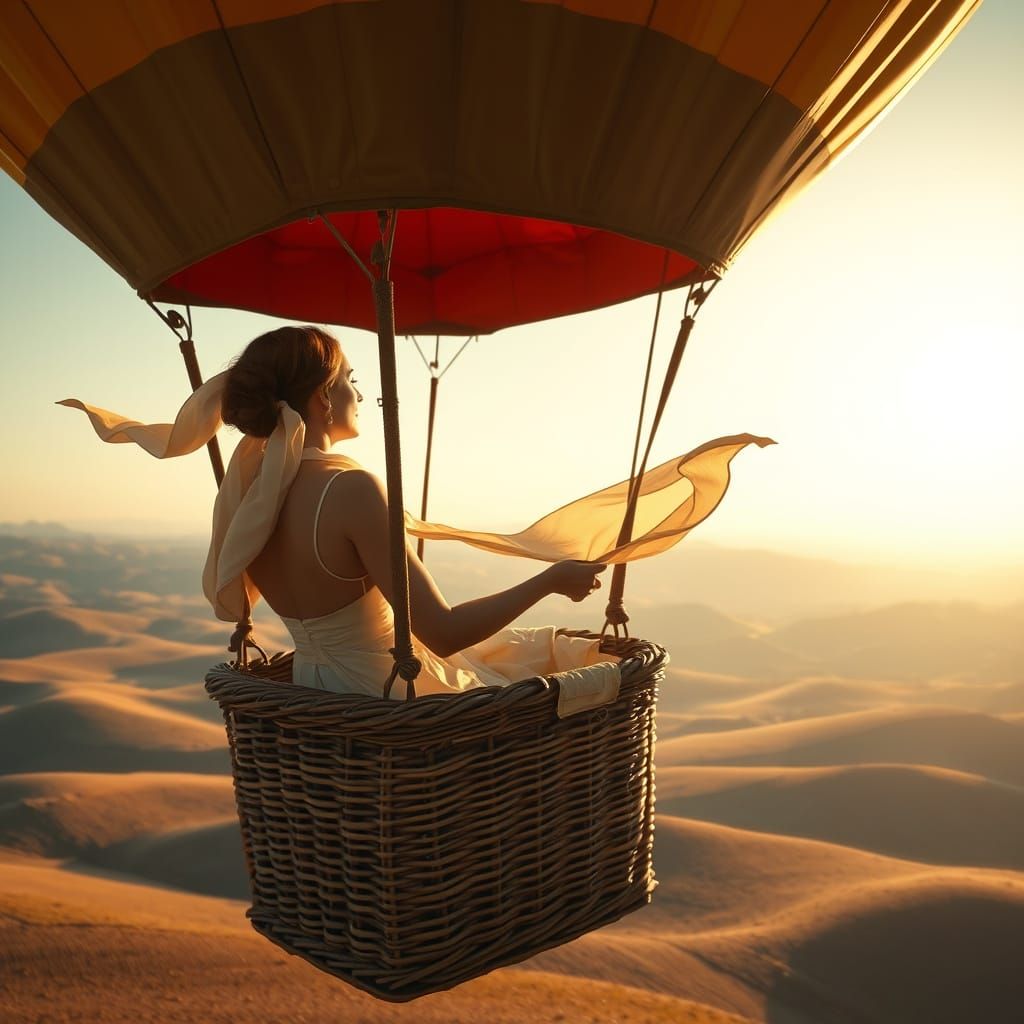 This image shows an elegant woman in a hot air balloon basket soaring over rolling hills during golden hour. Features rich, painterly textures and atmospheric perspective, evoking a sense of wonder.
