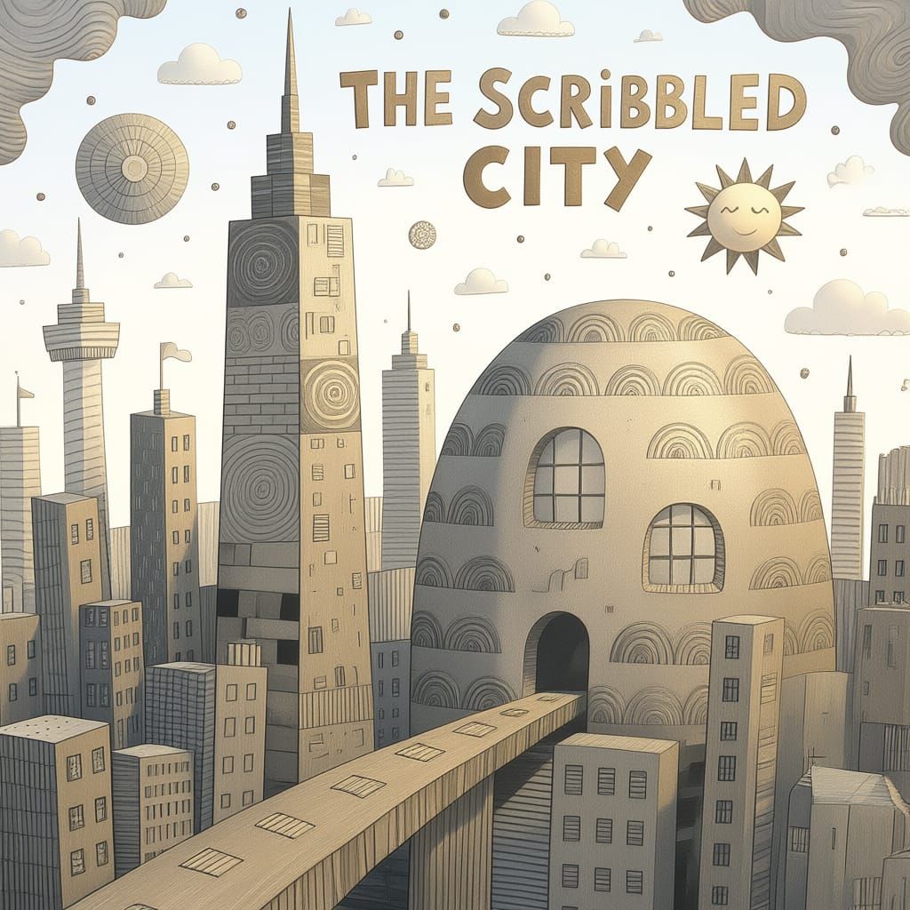 This image presents an abstract urban landscape composed entirely of intricate black line patterns on a white background, featuring unique architectural structures and geometric designs in a doodle art style.