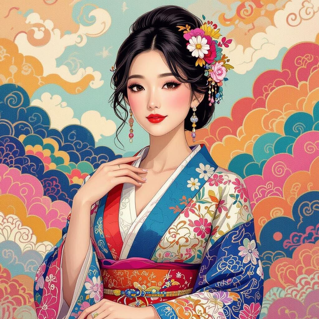 This image shows a beautiful woman in elegant attire, set against a vibrant and colorful backdrop. The artwork features intricate patterns and soft textures in a whimsical style.
