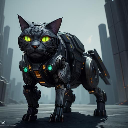 A futuristic, science fiction image of a cat with intricate mechanical details. The image is rendered in polished metal with a cinematic and dramatic atmosphere.