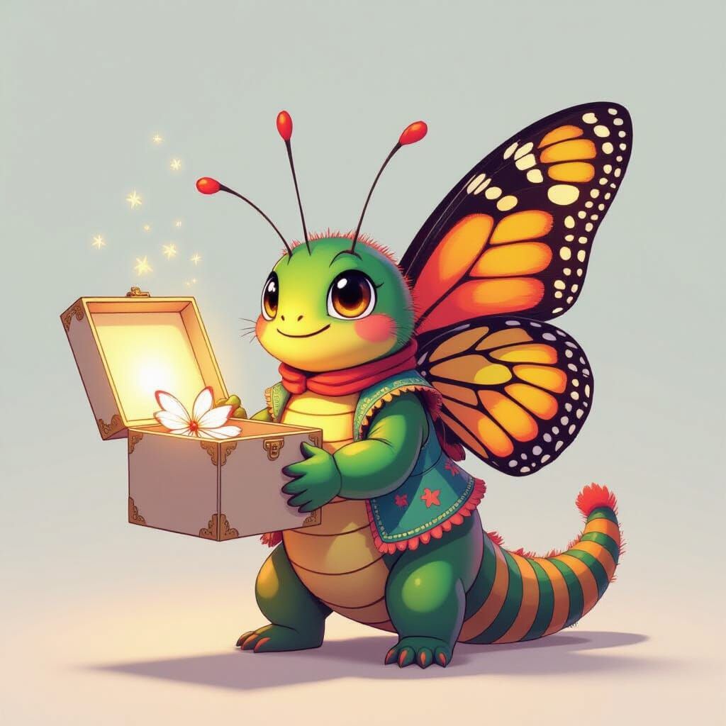 This image shows a brightly dressed caterpillar holding a box. Inside the box are butterfly wings. The background features soft gradients. The artwork is cel-shaded with rich colors in a manga style.