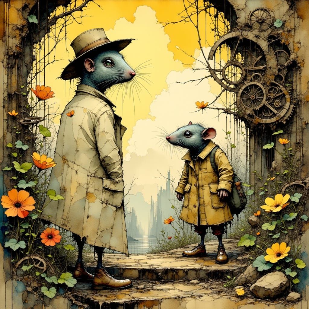 <lora:Ink Poet:1.0> <lora:Akimora:1.0> Imagine a lone, grizzled, anthropomorphic rat detective, clad in a tattered trench coat, standing amidst the ruins of a once-great clockwork city. Overgrown with vines and rust, the city's intricate gears and cogs lie silent, frozen in time. The badger's keen eyes ...