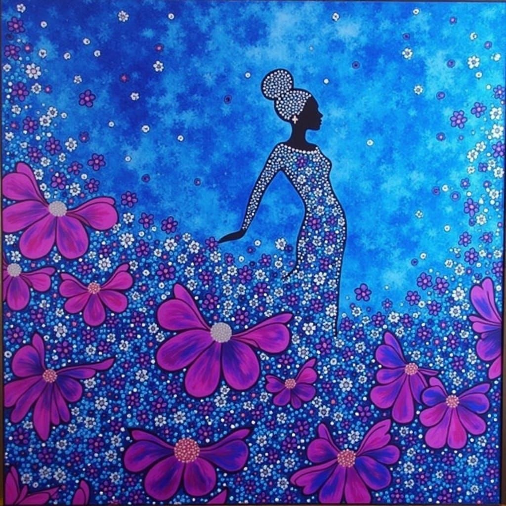 This image depicts a glamorous dancer with a vivacious spirit, wearing exquisite haute-couture. Her hair is adorned with shimmering jewels and pearls, creating a captivating and lustrous effect.