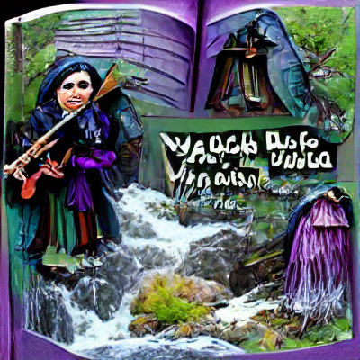 A whimsical illustration of Baba Yaga as a mariachi witch near a waterfall. The artwork evokes a storybook aesthetic with vibrant colors and fantastical elements.