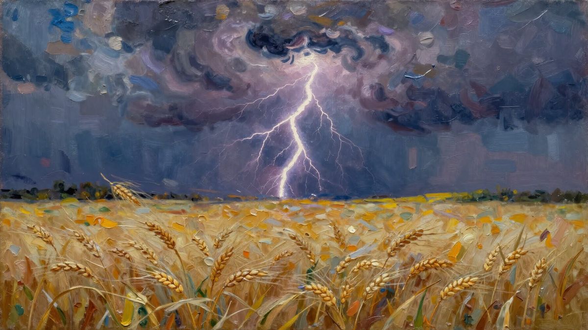 This image showcases a dramatic thunderstorm over a midwestern wheat field, depicted with thick, textured paint layers in an impasto style. Lightning illuminates the billowing grain and dark clouds.