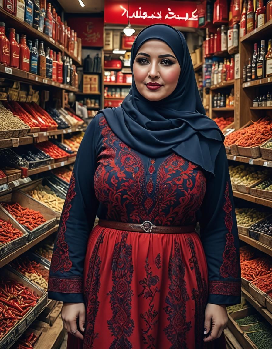 This image shows a beautifully detailed portrait of a Middle Eastern woman in a traditional hijab and modest dress, standing amidst the vibrant colors of a red chilli shop, capturing the essence of her cultural heritage in exquisite detail.