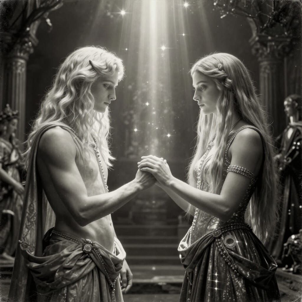 michelangelo and da vinci painting style, , luminous venusian grand blond gives hand to beautiful brune armenian woman with ultra straight hair, very connected spiritual, in the epic enden field of city of shamballah in background with third eye, ray of lights between characters, ultra deep contrast, ...