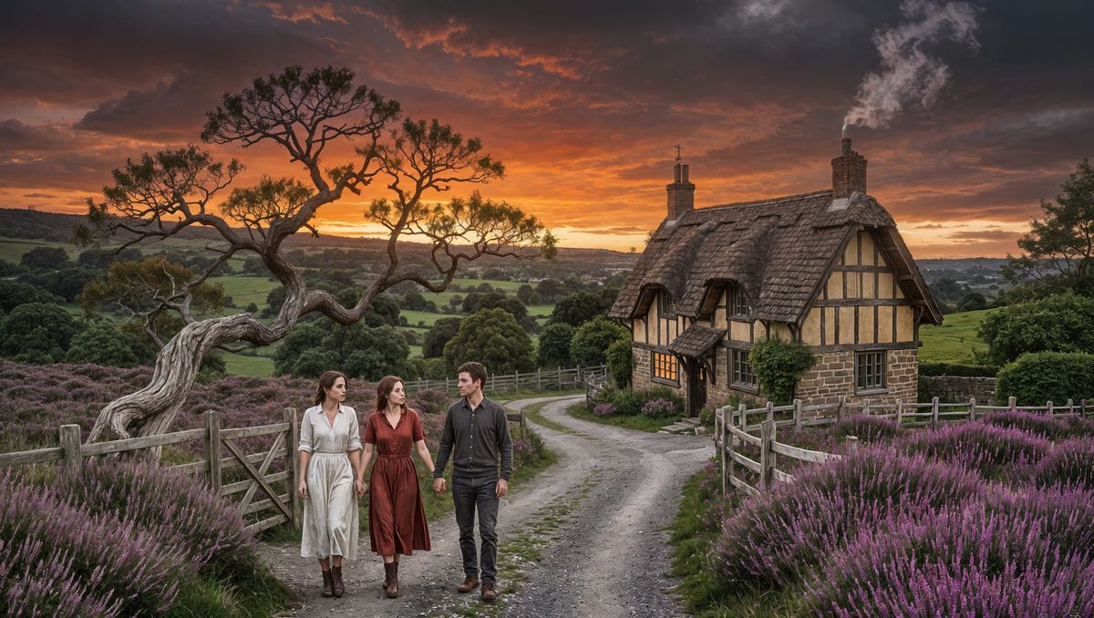 This image shows a young couple standing amidst heather flowers near an old willow tree, with a wooden fence and an old English cottage in the background, set against a dark and ominous sky with deep red hues.