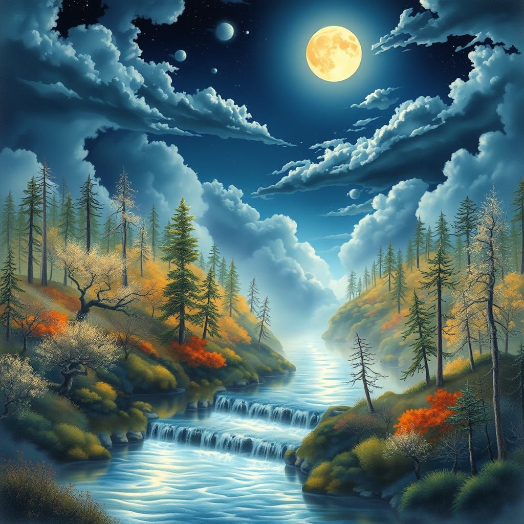 A cinematic watercolor painting of an all-silver scene with a surreal landscape. There are mesmerizing silver waterfalls, silver rivers flowing through a moonlit forest, and silver clouds hovering above. The scene evokes a sense of otherworldly beauty, with a touch of mysticism and magic.