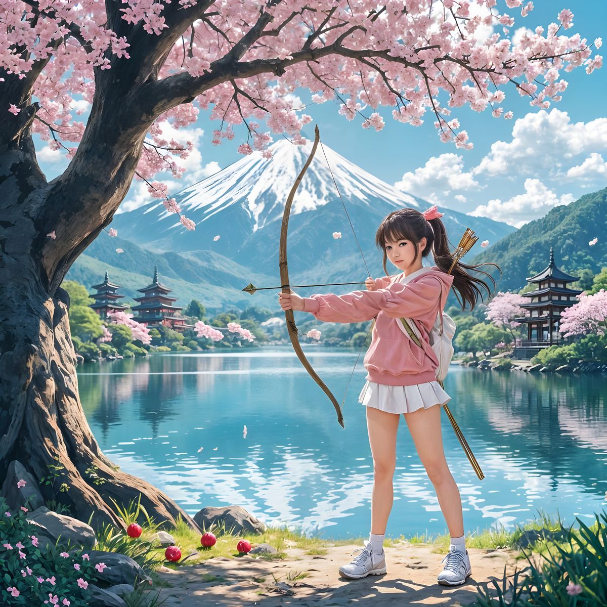 This image shows a Japanese girl in sporty attire standing near an ancient sakura tree by a lake. She's holding a bow and arrow, aiming at fruit with mountains and temples in the background.