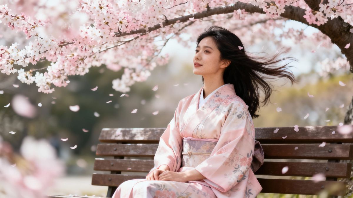 A stunning photograph captures a Japanese woman in a traditional kimono, seated beneath a cherry blossom tree. Her dark hair is windswept as petals fall, created with professional photography techniques and natural light.