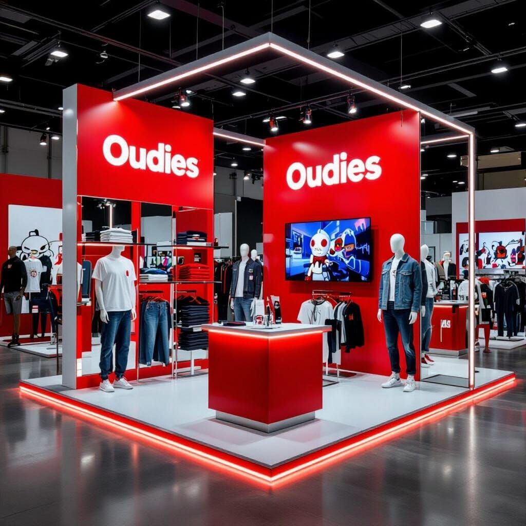 This AI-generated image showcases a vibrant 3x3 exhibition booth for OUDIES. It features a bold red and white color scheme, premium branding, and displays streetwear apparel, creating an energetic, modern vibe.