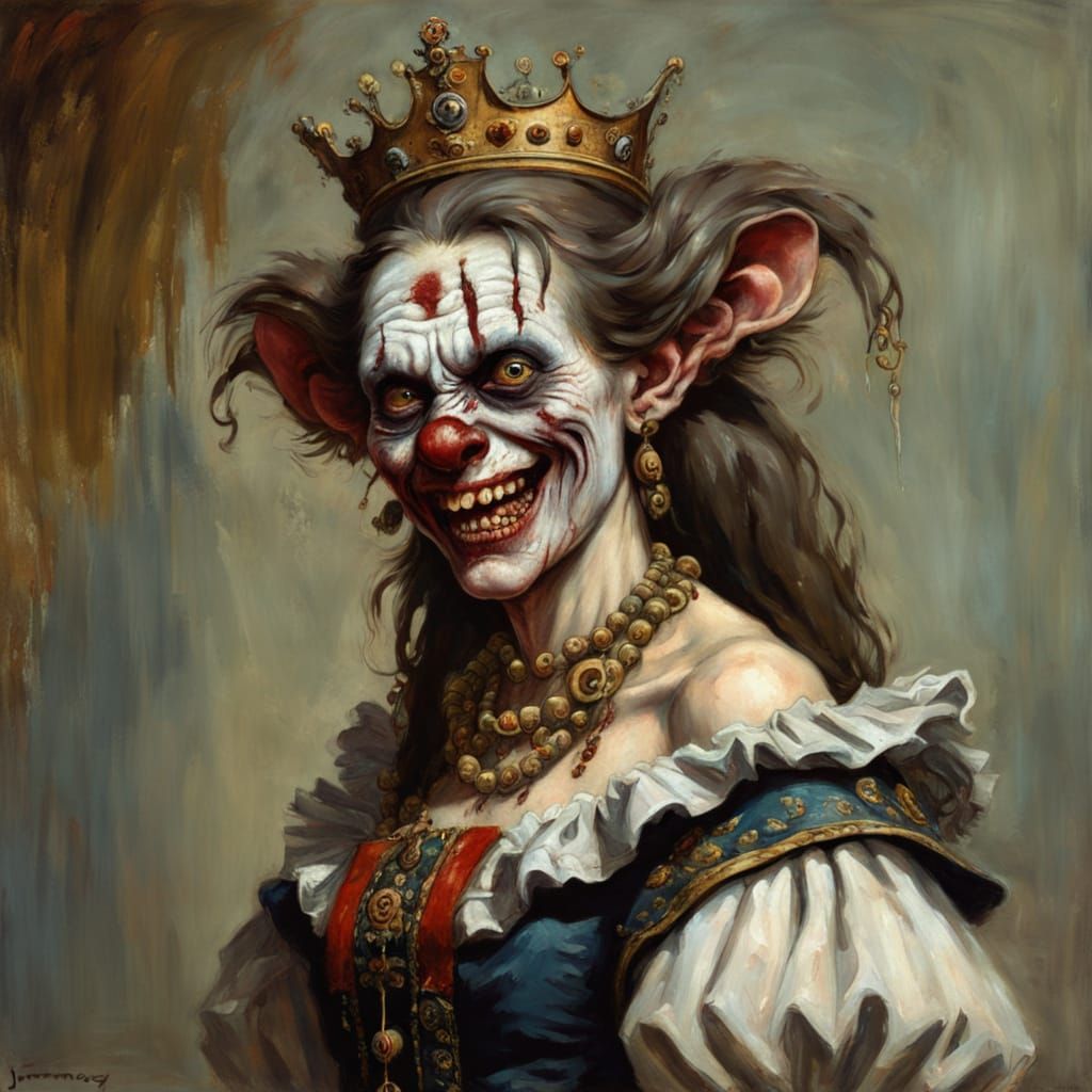 This image depicts a zombie monkey monster clown queen from 12th century Prussia, grinning maniacally. The artwork evokes historical oil painting techniques.